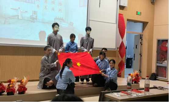 由殷森容,李梓恒,郑思源,徐海丽等同学主演的情景剧《狱中绣红旗》将活动推向高潮。在模拟渣滓洞监狱的昏暗场景中,当“江姐”低声宣告新中国成立的消息时,台上演员从震惊到狂喜的演绎,瞬间点燃了现场气氛。演员们将各自的誓言绣入红旗的每一针每一线,这面红旗,成为了一封写给新中国的、无声却最滚烫的“家书”。
