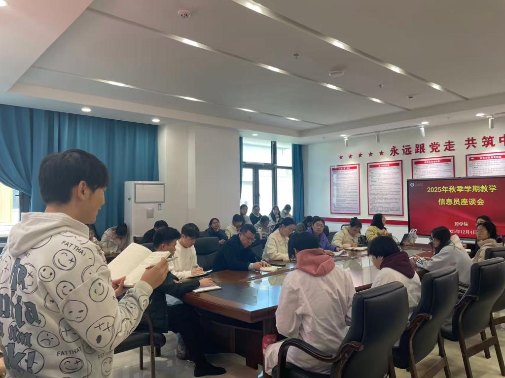 此次教学信息座谈会的召开,有效强化了学生、教师与学院之间的双向沟通,为搭建高效的教学反馈机制、培育优良学风、提升教学管理精细化水平、夯实人才培养质量奠定了坚实基础。未来,药学院将持续密切关注学生学情动态,不断优化教学管理模式,以更精准的服务、更务实的举措关心学生成长、助力学生成才,为培养高素质药学人才保驾护航。