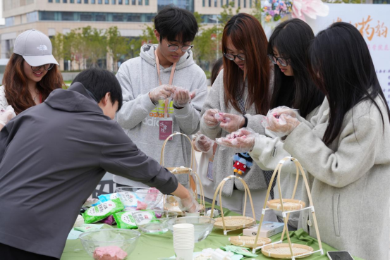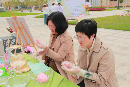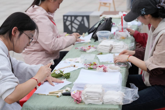本次花展紧扣花朝节“百花生日”的文化内核,以中医药为特色载体,设置了丰富多样的互动体验。投壶、簪花、制作草本香囊等经典花朝活动有序开展。同学们穿梭于花海之间,亲手挑选薄荷、艾叶、丁香等中药材制作香囊,在动手实践中感受传统手工艺的魅力,领悟中医药“治未病”的养生理念;“花朝拓染,花神点睛” 让师生以花叶为媒,制作拓染作品,让中医药文化以更鲜活的形式扎根心底。现场还设置了花类识别、中医药文化知识问答等环节,同学们踊跃参与,在欢声笑语中传承经典、汲取知识,尽显南医学子的青春风采与文化素养。